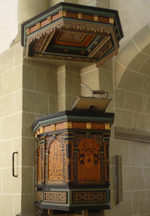 Die mit Intarsien und Schnitzereien verzierte Kanzel mit Schalldeckel zeigt die Zahl 1610 und einen Spruch aus Psalm 19. Unter allen Innenfeldern sind fortlaufend Inschriften aus dem 1. Petrusbrief, Kapitel 4 zu lesen.